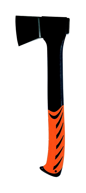 Hache de camping avec manche en fibre de verre renforcé de composite avec partie souple en élastomère thermoplastique avec trou de suspension. Tête forgée en acier carbone. Entièrement durci et trempé à 51 HRC