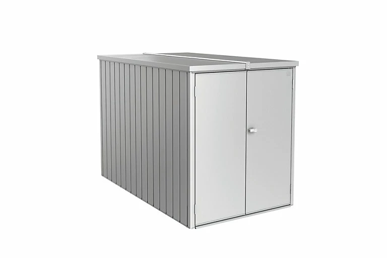 Le MiniGarage offre un espace de rangement idéal pour 2 vélos, des outils et mobilier de jardin. Avec une hauteur de 145 cm il ne nécessite pas de demande d’autorisation*. Le système de rail astucieux (option) facilite le stockage des vélos : placez la roue arrière sur le rail au sol, accrochez le guidon sur le rail supérieur extensible, poussez le vélo au fond du MiniGarge, terminé! Le système de rangement avec 2 étagères (longueur 150cm), coulissant vers l’extérieur pour ranger vos outils de jardin vous rendra de précieux services. Le MiniGarage : une conception moderne de rangement multifonction.